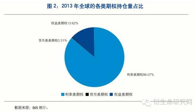 2013年,全球三大类期权的持仓量比重(如图2),其中:利率类期权占比达到了86.07%,居于绝对的地位;最小的是货币类期权,连1%都还不到。