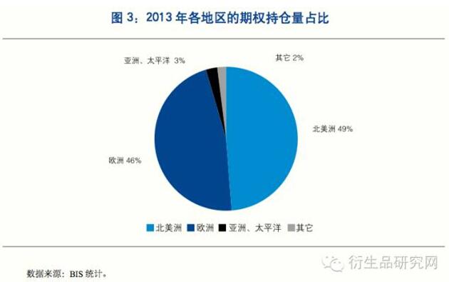 在2013年,从区域来看,期权的交易重地是北美洲、欧洲,两地区持仓量合计占比达到了95%(见图3)。它们不仅是交易最活跃的地区,也是期权品种创新的先锋。当然,最近几年,亚洲等新兴市场开始崛起,如韩国的KOPSI200指数期权和印度的Nifty指数期权,其交易量在全球排名都非常靠前。