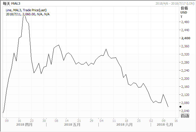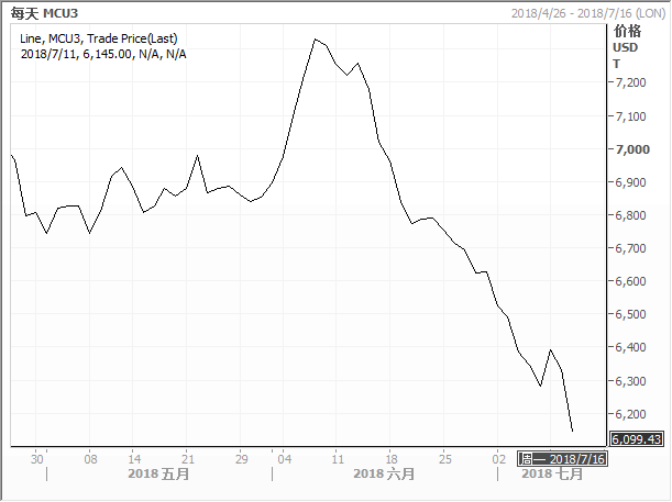 工业金属周三急挫,铜、锌和铅跌至约一年最低,因投机客在美中贸易冲突升级之际卖出。但价格摆脱低位,因部分消费者急于锁定价格,认为近期下跌后以当前价格买入物有所值。 “上海期交所今日跌幅更大,很清楚是这个动能推动的,但整个市场全面下跌,”荷兰安智银行商品策略师Oliver Nugent称。“我认为在当前水平我们看见大量的消费者买兴,我们的观点是达成贸易协议的机会很大,特别是11月的美国中期选举后,如果持这种观点,现在是很好的低吸买入机会。”特朗普政府进一步推升贸易争端水平,威胁对2,000亿美元中国商品征收10%关税,中国政府指责美国霸凌,警告称将出台反制措施。大宗商品中金属价格跌幅最大,镍、锡和铝跌至多月低位。伦敦金属交易所(LME)三个月期铜CMCU3最多跌4%,至每吨6,081美元,为去年7月以来最低,后反弹,公开喊价收报6,145美元,下跌2.9%。上海期交所锌价SZNcv1大跌6%,触及跌停板限制,报每吨20,620元,为去年6月以来最低。LME期锌CMZN3最多跌4.8%,报2,503美元,为2017年6月以来最低,之后缩减跌幅,收盘报2,563美元,下跌2.6%。LME期铅CMPB3反弹后未能企稳,收盘前跌势加剧,收低4.9%,报每吨2,200美元,为去年6月以来最低。LME期镍CMNI3从低位反弹,收盘报每吨13,880美元,下跌1.9%,低见至两个月低位13,570美元。期铝CMAL3下跌1.4%,收盘报2,060美元;期锡CMSN3挫2%,报19,375美元。路透东京7月11日 - 东京商品交易所(TOCOM)指标期胶周三下滑,随大宗商品普跌之势,此前美国威胁将对更多中国商品加征新关税,加剧了贸易紧张情势,有可能会压制全球经济成长。