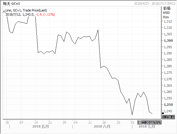 金价周三下跌,因美国威胁对额外2,000亿美元中国商品征收关税,推动资金流向避险美元,粉碎了美国方面最终会从不断升级的贸易冲突中退步的希望。美国总统特朗普昨夜发布了将被征收10%关税的中国产品清单,从现在开始将进行两个月的公开征询意见,然后将开始正式实施。消息将美元兑日圆推升至11个月高位,打击澳元,但欧元基本持平。“金价因商品市场普跌和美元走强而感受到压力,”High Ridge Futures金属交易董事David Meger称。1734 GMT,现货金XAU=涨0.9%,报每盎司1,243.57美元,稍早跌至八日低位的1,242.55美元。美国8月期金GCcv1收跌11美元,或0.9%,报每盎司1,244.40美元。全球最大黄金支持上市交易基金SPDR Gold SharesGLD的持金量周二减少0.22%,至799.02吨。在外围市场,全球股市下跌,金属价格急挫至一年低位,因担心贸易战。被看做是风险资产的股市下跌通常会扶助金价,因黄金是传统的避险资产。银价XAG=下跌1.4%,报每盎司15.82美元;铂金XPT=挫1.4%,报每盎司830.60美元,稍早,两者均跌至7月3日以来最低。钯金XPD=走低0.2%,报每盎司939.50美元,盘中跌至两周低位的931.40美元。