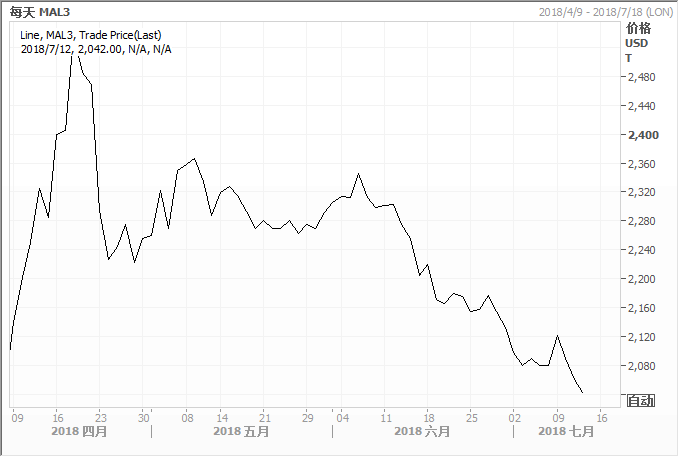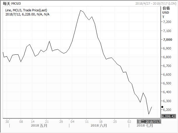 镍价周四反弹至一周最高,因投资者纷纷在他们认为的低价水平买入,此前贸易战忧虑拖累镍价大跌。镍价自6月初以来累计下跌14%,周三触及两个月低位。“镍有一个强有力的基本面故事,我认为投资者的观点是,在下跌近2,000美元之后,镍价正接近无论宏观杂音如何,都是一个有吸引力的切入点的区域,”德银金属分析师Nicholas Snowdon表示。“这尤其适用于中国投资者群体,其中许多人都是一直看多镍的。”镍是伦敦金属交易所(LME)基本金属中涨幅最大的金属,最多攀升3.8%,至每吨14,410美元的一周高位,后缩减涨幅,公开喊价最后报14,195美元,上升2.3%。期铜CMCU3上涨1.3%,收报每吨6,227.50美元,上一日大跌,降至去年7月来最低6,081美元。“我们看到在中国一个很大规模的多头头寸被结清。这样,创造出相对清晰的仓位情况,”Snowdon说。期铅CMPB3早盘降至2017年6月来最低2,139.50美元,后反弹,收报2,215美元,上涨0.7%。期铝CMAL3跌0.9%,收报每吨2,042美元。期锌CMZN3涨0.7%,报2,581美元。期锡CMSN3升1.3%,报19,630美元。
