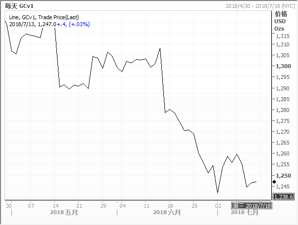 金价和银价周五跌至七个月低位,因美元升至两周高点,受助于美中贸易战激发的避险买盘。美国升息预期也导致黄金需求萎缩。1734 GMT,现货金XAU=下跌0.5%,报每盎司1,240.90美元,稍早跌至12月12日以来最低的1,236.58美元。美国期金GCcv1收跌5.40美元,或0.4%,报每盎司1,241.20美元。金价自4月中以来下跌约9%,本周可能跌1%。银价XAG=下跌0.6%,报每盎司15.80美元,稍早触及每盎司15.67美元,为12月13日以来最低。本周可能下跌1.2%。美元周五基本持平,此前升至两周高位,因数据显示,中国贸易顺差创历史新高,可能给美中紧张的贸易关系加码,刺激更多投资者涌向避险美元。“我们提高了美国联邦储备理事会(FED/美联储)升息预期,”U.S. Bank Wealth Management高级投资策略师Rob Haworth称。美联储在周五呈交给国会的一份乐观的半年度货币政策报告中称,今年上半年美国经济稳健增长,美联储仍预计将渐进升息。投机客近期将COMEX黄金净多头头寸减少至2016年1月以来最低水准。SPDR Gold Trust持金量自4月底以来下降超过8%,至不到2,600万盎司。铂金XPT=下跌1.9%,报每盎司823.5美元,钯金XPD=下跌1.6%,报934.80美元,两者本周均可能下跌近2%。