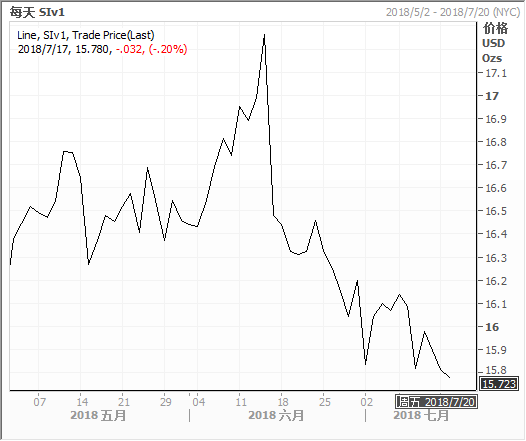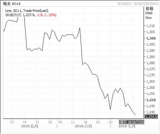 金价周一持稳,因主要黄金消费地区的实 货需求疲弱,且受美国升息预期打压,尽管美元失去上升动能。1733 GMT,现货金 XAU= 下跌0.2%,报每盎司1,239.11美元。美国8月期金 GCcv1 收跌1.50美元,或0.1%,报每盎司1,239.70美元 。美元走低令以美元计价的黄金对其它货币持有者来说变得便宜,通常会提振黄金需求,但主要黄金消费国--中国和印度的实货需求疲弱,预计 美国联邦储备理事会(FED/美联储)将继续升息打压黄金,交易员称。 “看似中国第二季数据给金属带来压力,”RBC Wealth Management 董事总经理George Gero称。第二季中国经济增速放缓,因中国政府致力于控制债务,损及经济活动,6月工业产出增速处于两年低位。6月,印度的黄金进口连跌第六个月,降至44吨,因卢比下跌提振本地黄金价格升至近21个月最高,限制了需求。美元下跌,因投资者减少对美元多头的押注,在周二美联储主席鲍威尔进行首次国会听证前调整头寸。全球最大黄金支持上市交易基金SPDR Gold Trust GLD 持金量自4月 底以来减少了逾8%,至不到2,600万盎司,表明投资者对黄金的需求下降。银价 XAG= 下跌0.1%,报每盎司15.77美元。铂金 XPT= 下跌0.2%,报每盎司824.10美元。钯金 XPD= 下跌2.2%, 报每盎司916.47美元,稍早触及4月9日以来最低的914.75美元。