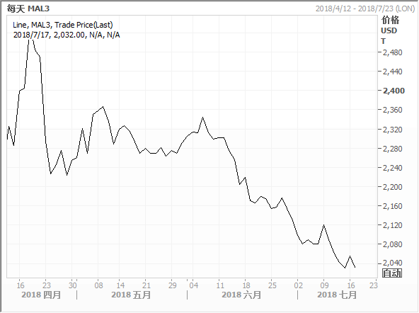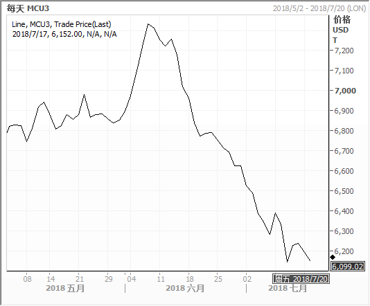 期铜周二小跌,与期铝和期镍一同走低,受累于美元走强,担心全球贸易战将会打压需求,以及最大金属消费国中国的经济增长放缓。指标LME期铜CMCU3收跌0.7%,报每吨6,152美元,接近7月11日触及的一年低位6,081美元,自6月初以来累计下跌约16%。期镍和期铝也处于或接近4月以来最低,期锌接近一年低位。负面人气推低价格,尽管供需基本面良好,法国兴业银行分析师Robin Bhar说。“每次反弹都遭遇抛售,”他说,“目前尚不清楚市场已经触底反弹,还是会再跌10%。”美元走强使以美元计价的金属对于持有其他货币的投资者来说更昂贵,从而打压金属价格。美国联邦储备理事会(FED/美联储)主席鲍威尔的乐观讲话暗示,美联储将会继续升息,这可能会进一步提振美元。另外,美国数据显示,美国6月工业生产增长,受助于制造业产出大幅反弹和矿业产出增加。在周一数据显示,中国第二季成长小幅放缓后,国家发改委表示,约6.5%的2018年经济增长目标仍可能实现。中国商务部表示,周一中国在世界贸易组织(WTO)就美国301调查项下对中方2,000亿美元输美产品征税建议措施追加起诉。期铝收跌1.1%,报每吨2,032美元,周五触及4月6日以来最低2,021.50美元,自6月初以来累计下跌近15%。期镍CMNI3受挫1.3%,报每吨13,490美元,盘中触及4月12日以来最低13,475美元。期锌CMZN3收涨1.5%,报每吨2,512美元,收复周一的部分失地。期铅CMPB3回落0.4%,收报每吨2,166美元。期锡CMSN3最后买入价为持平,报每吨19,500美元。