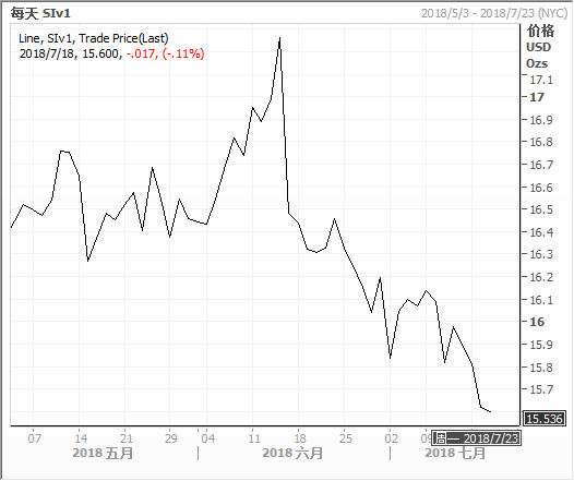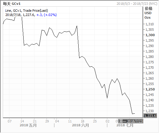 金价周二下跌逾1%,触及一年来最低,因美元在美国联邦储备理事会(FED/美联储)主席鲍威尔在国会作证期间走强。鲍威尔在参议院金融委员会作证时发表乐观的经济评估,市场预计,在经济继续扩张的背景下,美联储今年会再升息两次。美元兑一篮子货币在他作证期间走强,使以美元计价的黄金对非美国投资者而言更昂贵。“美元真的对这种‘金发女孩’效应和缓慢升息的环境作出反应。这通常是美元走强的秘诀,”High Ridge Futures的金属交易董事David Meger说。升息使持有无息黄金的机会成本增加。1736 GMT,现货金XAU=跌1.1%,报每盎司1,226.91美元,稍早触及去年7月以来最低1,225.58美元,年内迄今累计跌幅超过5%。美国8月期金GCcv1收跌12.40美元,或1%,报每盎司1,227.30美元。国际货币基金组织(IMF)周一警告称,在美国采取关税措施后,贸易紧张局势不断升级,可能会抑制中期成长前景。之前,中国公布第二季度经济增长放缓,不过北京方面表示,这不会影响其实现2018年的增长目标。瑞士银行经济学家考虑到贸易战升级影响,下调了中国成长预期。 “如果中国经济放缓,将对全球大宗商品消费产生影响,同时也会拖累金价走低,”中国最大的黄金上市交易基金(ETF)华安黄金的基金经理Richard Xu说。“中国黄金ETF的流动性近来大幅下降,这意味着人们在任何方向都看不到重大突破,”他补充道。由于与美国持续的贸易争端削弱了本国货币,全球最大黄金消费国中国对黄金的需求一直疲软。RJO Futures的Josh Graves说,现货金可能突破1,220美元的支撑位,和重要心理位1,200美元。现货银XAG=跌0.9%,报每盎司15.60美元,盘中跌至2017年7月以来最低15.51美元。现货铂金XPT=回落1.2%,报每盎司812美元,盘中触及两周低位808.89美元。现货钯金XPD=下跌0.4%,报每盎司913.50美元,盘中触及4月9日以来最低905.05美元。