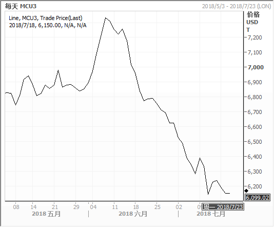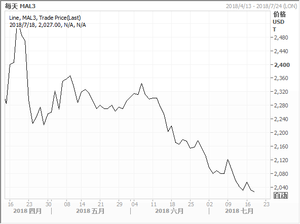 伦敦金属交易所(LME)锌价周三创一年最大单日升幅,从本周触及的一年低点反弹,因逢低承接和库存减少,而期铜和期铅则触及一年低点,因美元走强和贸易争端持续。上周上海期锌库存ZN-STX-SGH减少16,919吨至58,016吨,为2008年2月以来最低。LME锌库存MZN-STOCKS也连降六天。“基本上,锌市场短线呈超卖,所以消费者买入带动锌价反弹,”Marex Spectron金属分析师Alastair Munro表示,他预计基本金属短期内可能被进一步抛售。三个月期锌CMZN3收高3.5%,报每吨2,027美元,创去年8月来最大单日升幅,本月锌价大跌约8%,曾触及一年低点。现货锌较三个月期锌溢价26美元,一周前报8.50美元,显示短期供应紧张。三个月期铜CMCU3收平,报每吨6,150美元,盘中触及一年低点6,080美元,三个月期铅CMPB3收高0.2%,报每吨2,170美元,盘中曾跌至一年最低的2,131美元。“对中美贸易争端将升级的担忧,以及对中国经济降温的忧虑将继续打压(金属)价格。而且,价格面临美元坚挺的不利因素,”德国商业银行在一份报告中指出。中国外交部发言人华春莹周三表示,美国打贸易战不仅针对中国,还以全世界为敌。日益升级的贸易战已成为世界经济最大的“信心杀手”,将破坏来之不易的复苏态势,动摇全球经济增长的根基。其他金属中,期铝CMAL3收跌0.3%,报每吨2,027美元,期锡CMSN3收低0.1%,报每吨19,475美元。期镍CMNI3受高0.9%,报每吨13,615美元,盘中触及4月来最低。