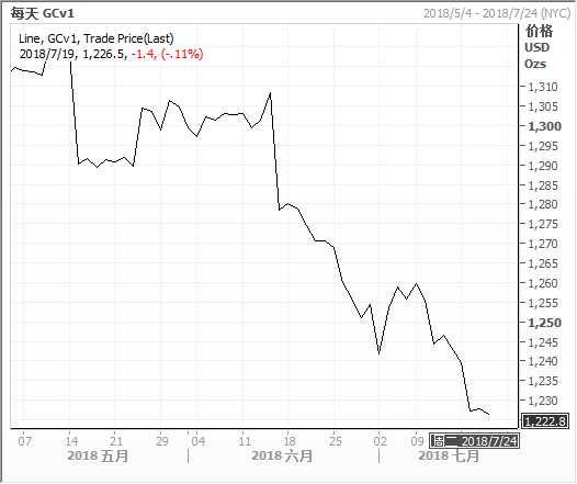 金价周三回稳,因美元从三周高位下滑,金价此前一度触及一年低点,因美国联邦储备理事会(美联储/FED)主席鲍威尔对美国经济的乐观看法带动美元走坚。“美元稍后回落了一些,带动金价由跌转升,但我认为这是暂时性的。”Dillon Gage的Walter Pehowich表示。自4月中触及1,365.23美元峰值后,金价已经跌了逾10%,受美元走强和美国加息打压。1850 GMT,现货金XAU=持平,报毎盎司1,227.26美元,盘中曾触及2017年7月14日以来最低水平1,220.81美元。美国8月期金GCcv1收高0.60美元或0.1%,报每盎司1,227.90美元。“在目前的环境下,油价也下跌,投资人对通胀上升的担忧减轻,这对金价也是不利因素。”丹麦丹斯克银行高级分析师Jens Pedersen称。美元周三从三周高位略有回软,之前在美联储主席鲍威尔对美国经济前景作出乐观展望后,美元全线走强。较长期而言,一些分析师预计,美元强势将消退,可能出现的缘政治忧虑及大量黄金空头仓位将扶助金价反弹。其他贵金属方面,现货银XAG=跌0.1%,至每盎司15.56美元,稍早触及去年7月10日以来最低的15.38美元。现货铂金XPT=跌0.2%,至每盎司814.20美元,盘中一度触及两周低位798.14美元。现货钯金XPD=跌0.5%,至每盎司906.47美元,盘中跌至4月9日来最低的902.97。