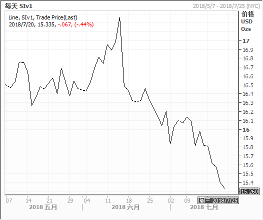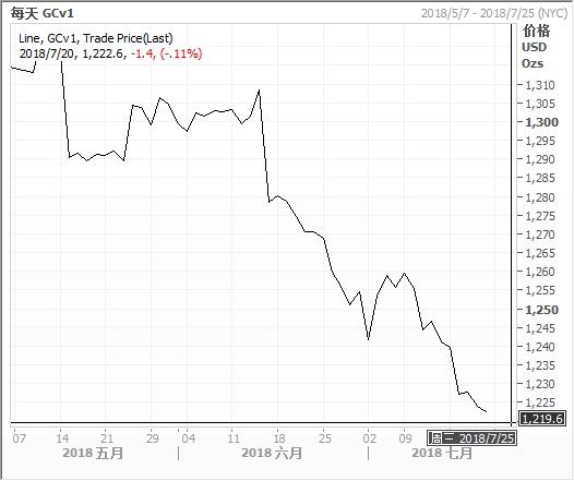 金价周四跌至一年低点,因在美国联邦储 备理事会(美联储/FED)主席鲍威尔的讲话巩固了对美国今年还将加息的预 期后,美元走强。金市同美国利率前景息息相关,因加息会推高持有非孽息资产的机会成本,并提升美元。美联储在6月加息,决策者暗示预计今年还将加息两次。鲍威尔在本周两日国会作证时并没有暗示会出现其他情况。1815 GMT,现货金 XAU= 跌0.3%,报毎盎司1,223.15美元,盘中曾触 及2017年7月以来最低水平1,211.08美元。美国8月期金 GCcv1 收挫3.90美元或0.3%,报每盎司1,224美元。金价之后一度短暂升至平盘之上,因在美国总统特朗普对CNBC电视表 示,他对加息“并不兴奋”,因加息带动美元走强,令美国出口商品在海 外更贵后,美元兑一篮子主要货币下滑。但美元之后收复部分失地,至昨日收盘水准附近。金价则一度追平昨日高位,之后回落。其他贵金属方面,现货银 XAG= 跌0.7%,至每盎司15.42美元,稍早 触及一年最低的15.13美元。现货铂金 XPT= 跌0.6%,至每盎司808.50美元,盘中一度触及2008年 12月来低位788美元。现货钯金 XPD= 重挫3.1%,至每盎司878美元,盘中跌至去年7月来最 低的859.50。