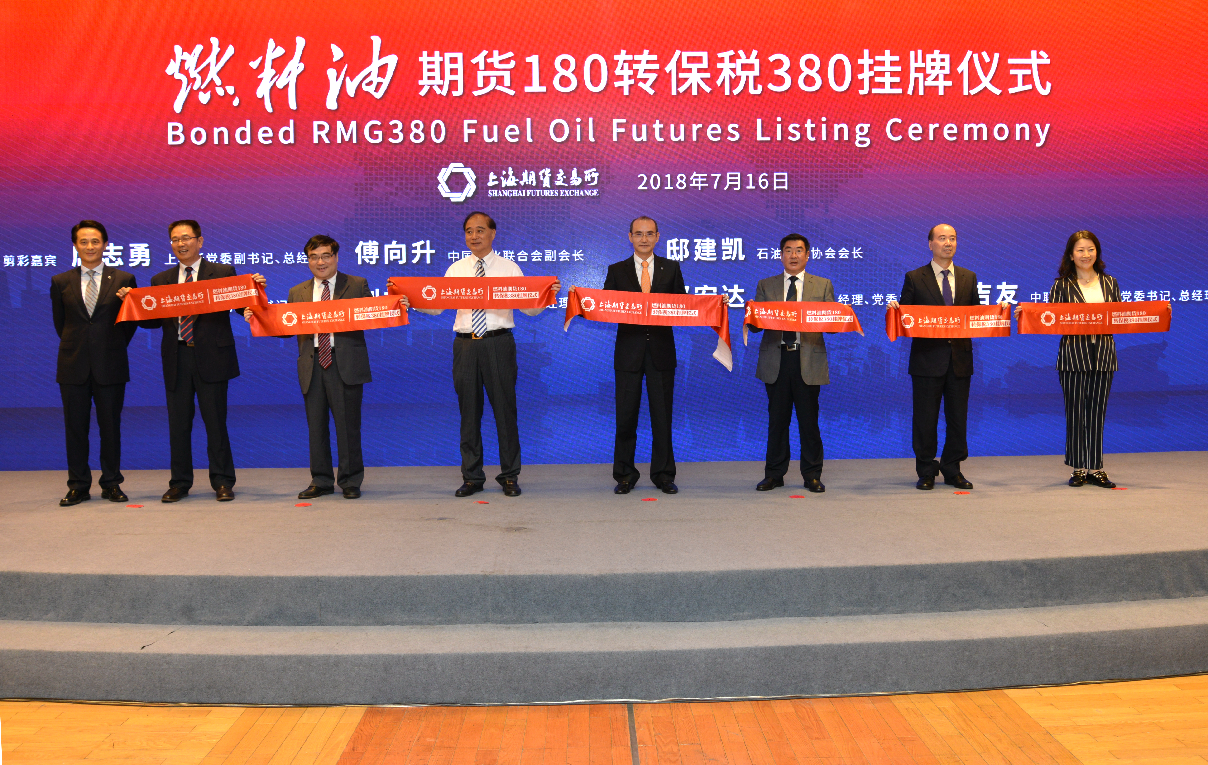上期所燃料油期货180转保税380挂牌仪式暨燃料油期货服务实体经济发展座谈会今日在上海召开。中国石油和化学工业联合会副会长傅向升,中国石油流通协会会长邸建凯,中国船舶燃料有限责任公司总经理孙厚刚,中国石化燃料油销售有限公司总经理刘祖荣,中石化中海船舶燃料供应有限公司总经理鄂宏达,华东中石油国际事业有限公司总经理于吉友,上期所总经理席志勇、监事长陆文山等交易所领导,以及来自海关、石油企业、指定交割油库、指定检验机构、期货公司、投资公司、资讯机构等120余名领导与嘉宾出席了会议。上期所副总经理滕家伟主持仪式。